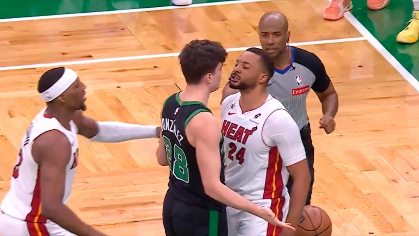 Hugo González se encara con Norman Powell, jugador de los Heat, en el partido entre Boston y Miami.