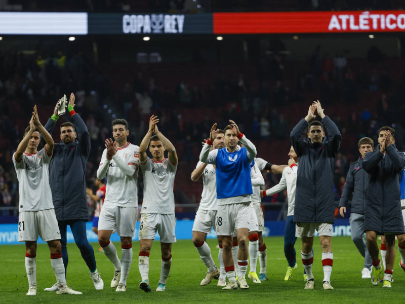 MADRID, 07/02/2024.- Los jugadores del Athletic Club celebran su victoria a la finalización del encuentro correspondiente a la ida de las semifinales de la Copa del Rey que Atlético de Madrid y Athletic Club han disputado este miércoles en el estadio Metropolitano, en Madrid. EFE/Juanjo Martín.