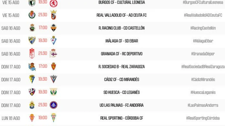 Para el domingo 17 de agosto, tendremos otros cuatro partidos: Real Sociedad B - Real Zaragoza, Cádiz - Mirandés, SD Huesca - CD Leganés y UD Las Palmas - Andorra.
