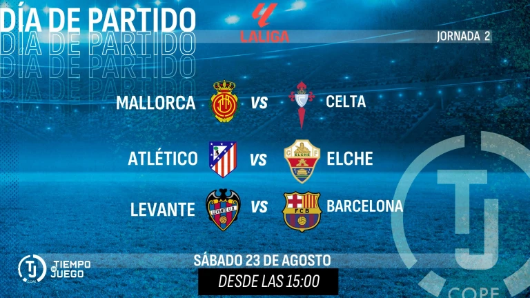La segunda jornada de LaLiga 2025-26 continuará este sábado 22 de agosto con tres partidos. El Mallorca recibirá al Celta de Vigo en Son Moix para dar comienzo a la tarde de fútbol (17:00). Dos horas y media más tarde, arrancará en el Metropolitano un apasionante Atlético- Elche (19:30). El último partido del día, se disputará en Valencia el Levante-Barcelona (21:30). Toda la emoción la podrás seguir en Tiempo de Juego con Paco González y Manolo Lama desde las 15:00 horas, en COPE.