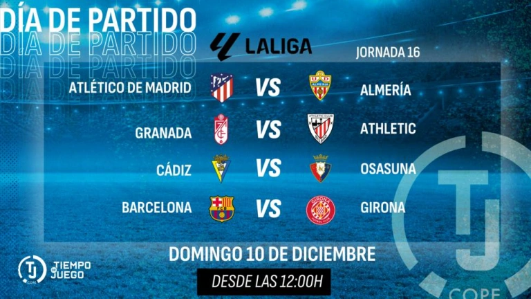 Hasta cuatro partidos hay este domingo en la 16ª jornada en Primera División donde sobresalen por encima de todos el Atlético de Madrid-Almería y el Barcelona-Girona, pero además, se jugarán el Granada-Athletic y Cádiz-Osasuna.
