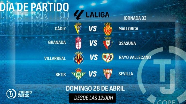 Paco González y Manolo La te esperan este domingo para vivir toda la emoción de los partidos de la 33ª jornada: Cádiz-Mallorca, Granada-Osasuna, Villarreal-Rayo y Betis-Sevilla.