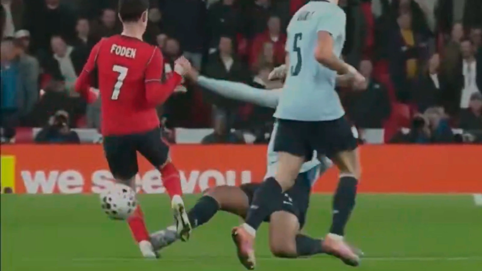 La jugada ocurrió alrededor del minuto 55 del encuentro. Foden avanzaba con el balón por el centro del campo cuando Araujo, en su afán por recuperar, llegó con un plantillazo tardío y fuerte directamente sobre el tobillo izquierdo del inglés. El tobillo de Foden se torció de forma visible tras el impacto, y el jugador cayó al suelo con evidentes gestos de dolor.