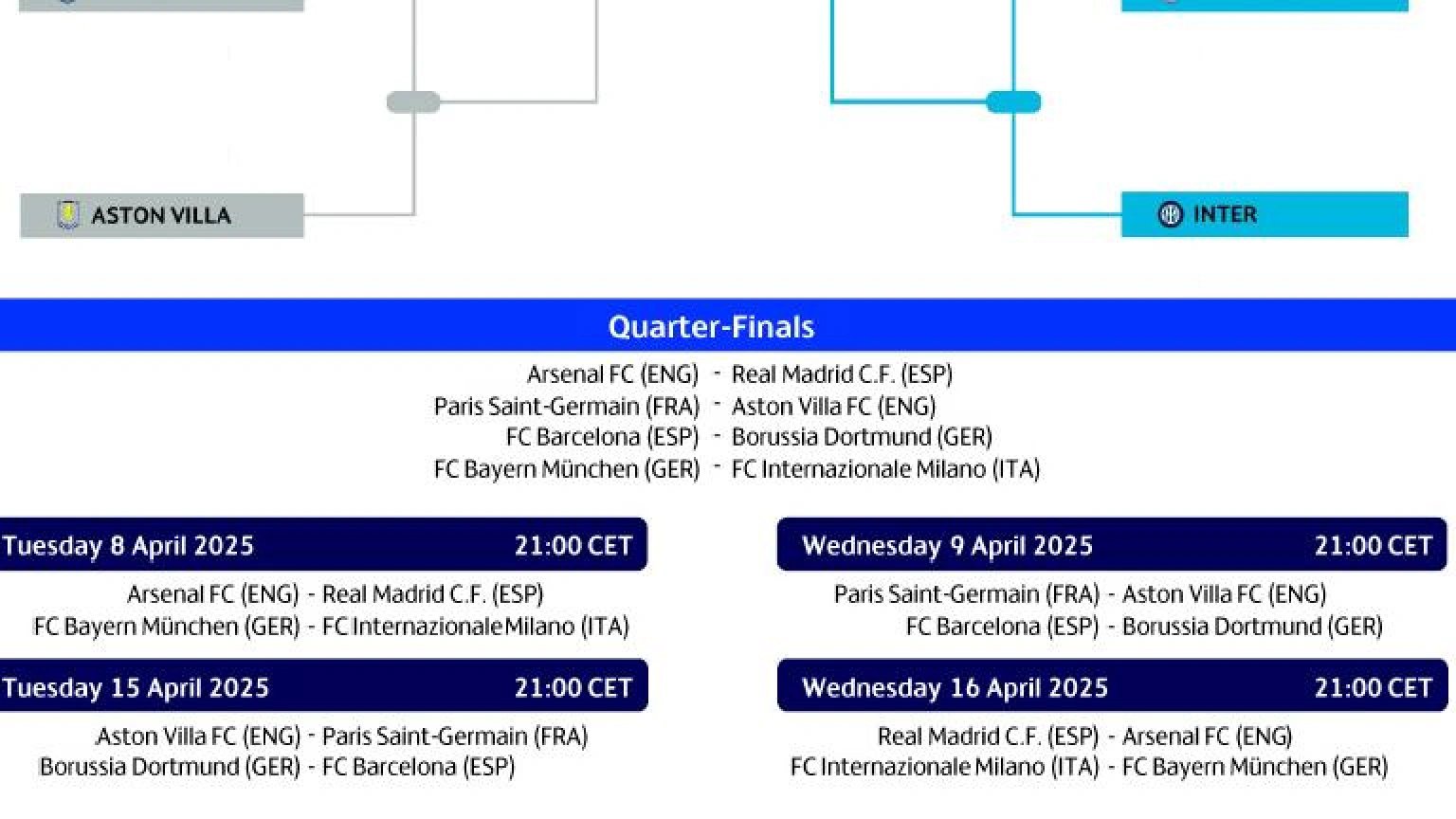 Los cuartos acabarán el miércoles 16 con los partidos Real Madrid-Aston Villa en el Santiago Bernabéu e Inter-Bayern Múnich en el Giuseppe Meazza.
