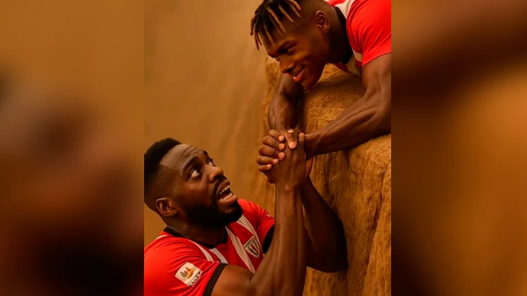 En este caso, Iñaki Williams es el personaje que encarna a Mufasa, el padre del Rey León que en un momento del film lucha por sobrevivir a en un barranco ante la desafiante mirada de su hermano Scar, que tras un tenso cruce de miradas y palabras, deja morir a su hermano. Si Iñaki es Mufasa, Scar es Nico Williams.