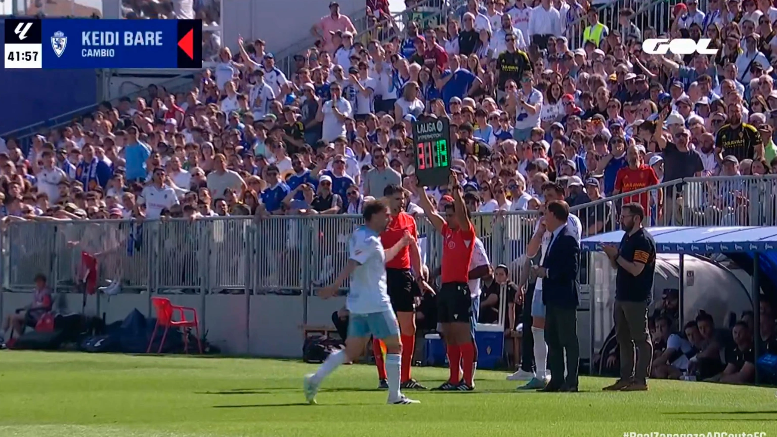 Corría el minuto 42 de partido y el Ceuta ganaba 0-1, gracias a un tanto de Konrad, la gente se impacientaba y al Real Zaragoza no le salían las cosas. La decisión de su técnico, David Navarro, ha sido fulminante. Un triple cambio: Ha quitado al lateral derecho (Martín Agirregabiria), al mediocentro (Keidi Bare) y al extremo izquierdo (Hugo Pinilla), para dar entrada a Kenan Kodro, Juan Sebastián Serrano y Mawuli.