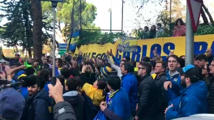 Aficionados de Boca Juniors alientan a sus jugadores de cara a la final de la Copa Libertadores en la puerta del hotel de concentración.
