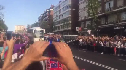 Miles de aficionados del Real Madrid recibieron al autobús de la plantilla madridista que trasladó a los jugadores de Zinedine Zidane antes de enfrentarse al Bayern Múnich.