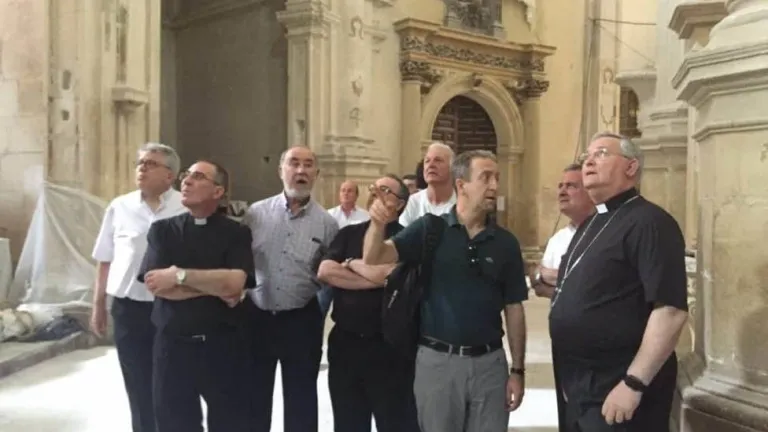 Acompañado por el Consejo de Vicarios, el Obispo de Cartagena ha comprobado esta mañana cómo marchan las obras de restauración de la antigua Colegiata de San Patricio de Lorca. El arquitecto de la obra, Juan de Dios de la Hoz, les ha explicado las actuaciones que se están llevando a cabo para devolver el esplendor del templo que se vio afectado por los terremotos de 2011.