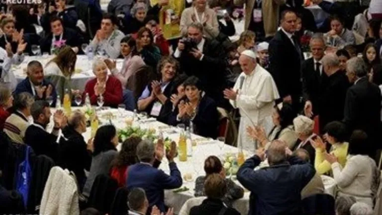Después de la Santa Misa y del rezo del Ángelus, el Papa Francisco almorzó en el Aula Pablo VI con 1.500 personas menesterosas, compartiendo un momento de fiesta.