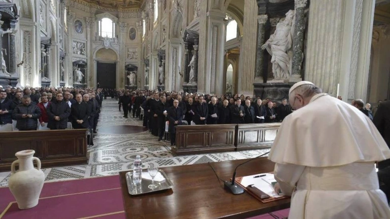 Francisco finalizó su discurso invitando a los miembros del clero romano a pedir perdón a Dios y a sus hermanos por cada pecado que ha socavado la comunión eclesial y sofocado el dinamismo misionero: "Sean los primeros en pedir perdón", dijo el Pontífice, al tiempo que relanzó el apoyo a la campaña diocesana de Caritas "en la tierra como en el Cielo", para vivir la Cuaresma de la caridad y responder a todas las pobrezas acogiendo y apoyando a los necesitados.