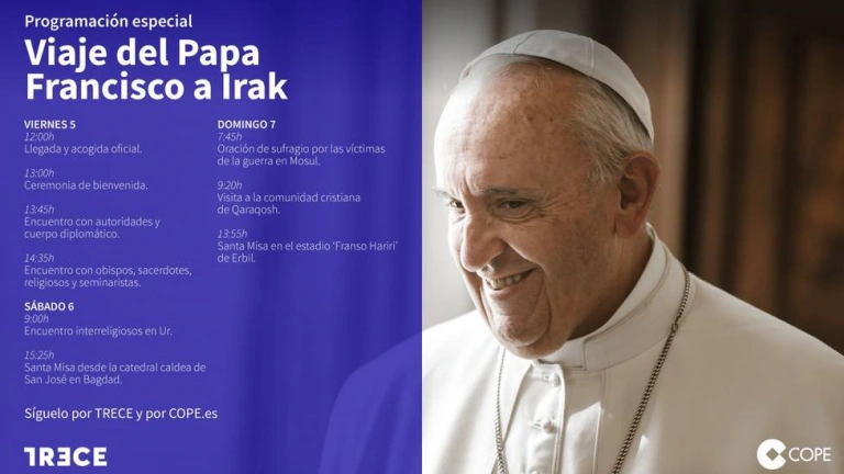 Además de poner el foco en cada uno de los programas de la cadena, desde la primera toma de contacto del papa Francisco a su llegada a Irak, que se vivirá en directo en "La Lupa", con Ana Samboal e Irene Pozo, este viernes a las 12.00h, TRECE analiza todos los detalles y el significado de este viaje histórico.