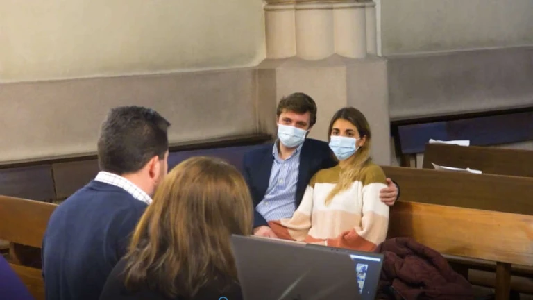 Las parejas que conforman Rocío y Javier y Pablo y Marta acuden cada semana a la parroquia de San Aurelio, ubicado en el madrileño barrio de Argüelles, para recibir estos cursos prematrimoniales. En el templo, los ponentes imparten las clases a los presentes ( con mascarilla y respetando las distancias de seguridad) y a quienes la siguen online.
