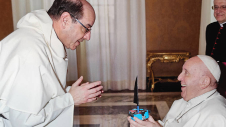 El director del Departamento de Pastoral Penitenciaria y capellán de la prisión de Castellón I saludó al Papa y le regaló una barca realizada por los presos