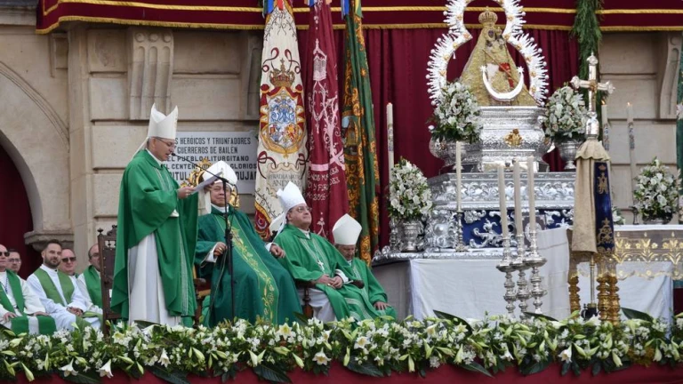 El obispo de Jaén comenzó la Santa Misa dando la bienvenida al Nuncio. En sus palabras subrayó el amor de los españoles por la Madre de Dios, a la vez que quiso explicar al representante del Papa en nuestro país la gran devoción que a lo largo de casi 8 siglos se tiene a esta advocación. “Desde hace casi 800 años, esta bendita imagen que nos preside, la de la Santísima Virgen de la Cabeza, ha sido el consuelo, la esperanza, la meta, la alegría… para generaciones de jiennenses que encuentran en esta talla pequeña, morenita y bendita, a la Madre de Dios”.