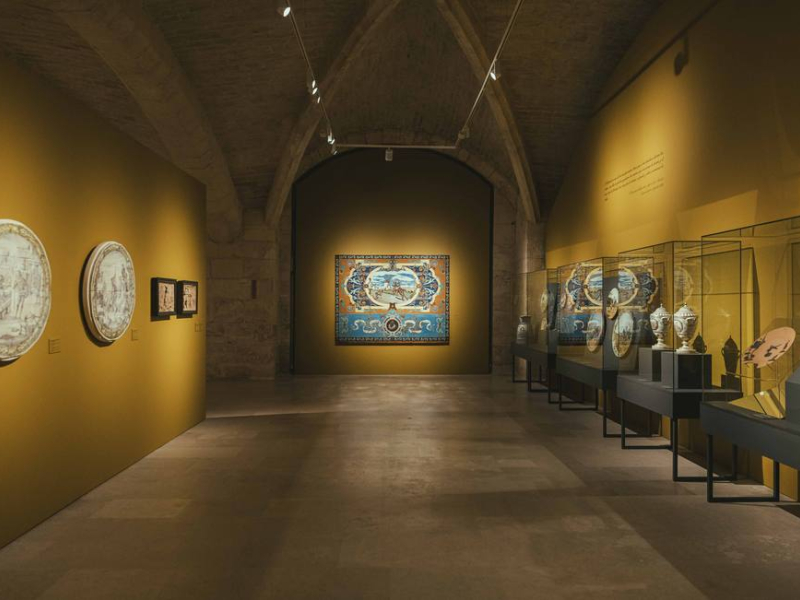 Nueve piezas se han restaurado ex profeso para la exposición ‘El Quijote, la gran parodia cervantina’. Así, lucen su mejor aspecto dos dibujos y un panel de azulejos de la Fundación Zuloaga, un abanico y tres platos tarjeteros del Museo Nacional de Artes Decorativas, y dos relieves de terracota del Museo Nacional de Cerámica y Artes Suntuarias ‘González Martí’ de Valencia.