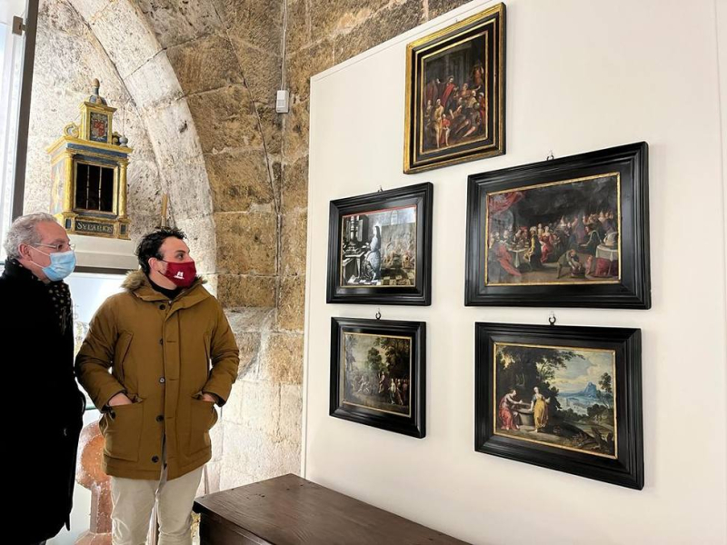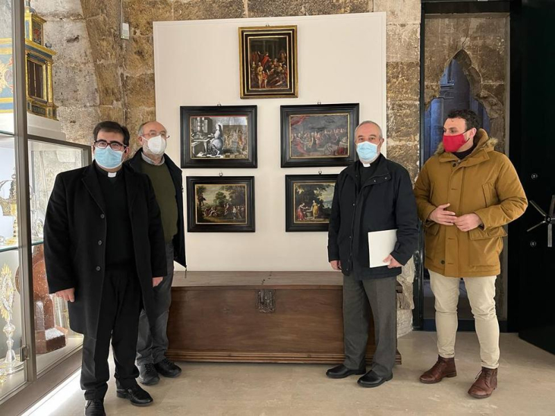 Cuatro de esas pinturas sustraídas y ahora recuperadas representan el Festín de Baltasar, el encuentro de Jesús con la samaritana, la Entrada triunfal de Jesús en Jerusalén y la Expulsión de los vendedores del Templo, obras del pintor José de Paz Ribera, quien probablemente los realizaría durante su estancia en Toledo, entre 1724 y 1725. El quinto cobre representa a San Miguel Arcángel, según el modelo creado por Maarten de Vos y difundido por el grabador Hieronymus Wierix en la década de 1580; su autor posiblemente sea Cristóbal Vela Cobo, pintor andaluz del siglo XVII.