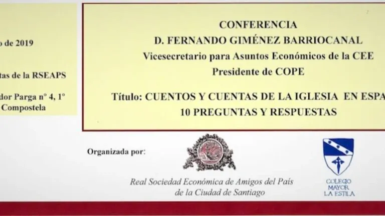 Fernando Giménez Barriocanal, vicesecretario para Asuntos Económicos de la Conferencia Episcopal Española (CEE) y presidente y consejero delegado de COPE, pronunciará mañana martes día 26 de marzo, en los locales de la Real Sociedad Económica de Amigos del País, una conferencia bajo el título de "Cuentos y cuentas de la Iglesia en España: 10 preguntas y respuestas". La conferencia está organizada también por el Colegio Mayor La Estila. El acto tendrá lugar en la sede de la sociedad, Plaza de Salvador Parga, 4 ? 1º (Ánimas), en Santiago, a partir de las 19:30 horas.