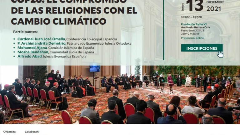 Con el título «COP 26: el compromiso de las religiones con el cambio climático», el próximo 13 de diciembre, a las 18:00 horas, se reunirán en el auditorio de la Fundación Pablo VI los líderes de las principales religiones en nuestro país para reflexionar y poner en valor su papel y compromiso con el cambio climático y el cuidado de la Casa Común, a partir de la COP26 celebrada el pasado noviembre en Glasgow.