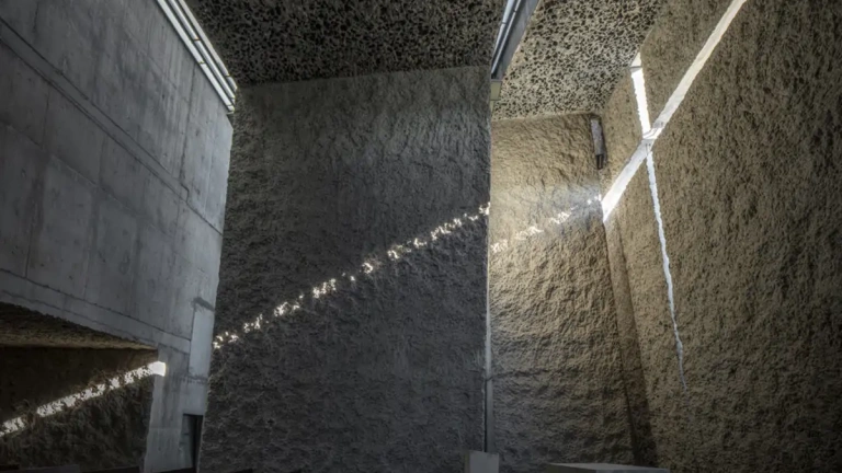 La materialidad del edificio es una de sus señas de identidad, con un uso predominante del hormigón visto y la piedra volcánica de la propia isla. "Aquí basalto en esta isla volcánica, no nos falta", comenta el arquitecto. Se han empleado también puzolanas y piedras muy porosas que contribuyen a una excepcional absorción acústica, un aspecto clave del diseño. De hecho, Menis explica que el proyecto es una continuación de su obra Magma Arte & Congresos, en el sur de Tenerife, y que las soluciones acústicas aquí aplicadas se desarrollaron posteriormente en un auditorio de referencia internacional en Polonia.