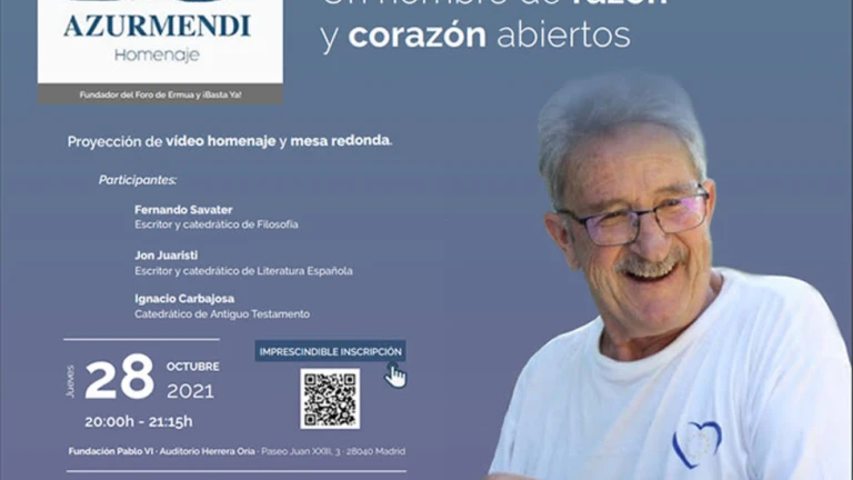 La Fundación Pablo VI y Páginas Digital convocan un acto de homenaje al antropólogo y escritor Mikel Azurmendi, cofundador de ?Basta Ya? y el Foro de Ermua, y una de las primeras voces en alzarse contra el terrorismo de ETA. Tendrá lugar el próximo día 28 de octubre, a las 20:00 horas, en el Auditorio Herrera Oria de la Fundación Pablo VI, en el Paseo Juan XXIII, 3, en Madrid.