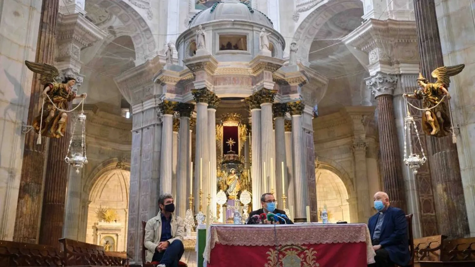 Tras año y medio de arduas labores de trabajo en las que las esculturas se han sometido a procesos de consolidación y de limpieza, este lunes 19 de octubre, se ha presentado el resultado de la finalización de los trabajos de restauración de los "Ángeles Lampareros", que han recuperado su ubicación en los laterales del altar mayor de la catedral de Cádiz. El deán de la catedral, Ricardo Jiménez, ha asegurado que ha sido un proceso laborioso, pero del que han quedado muy satisfechos del resultado final. "La finalidad del Cabildo, al restaurar el patrimonio que tiene encomendado, es que siga cumpliendo la labor para la que fue confeccionado, dar gloria a Dios a través del culto sagrado. Por ello, tenemos la responsabilidad de mantenerlo de la manera más digna. El Cabildo, a pesar de estos duros momentos, sigue invirtiendo en el mantenimiento del patrimonio para que sea cada vez más conocido y más apreciado".