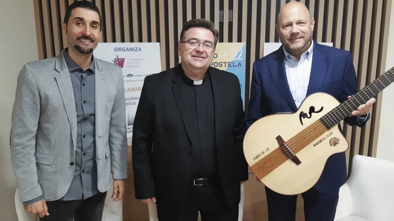 responsable de la PEJ y director de la Subcomisión de Infancia y Juventud de la Conferencia Episcopal Española, recibió la guitarra de manos de Manuel Rodríguez, entregándosela a su vez al compositor, autor y productor