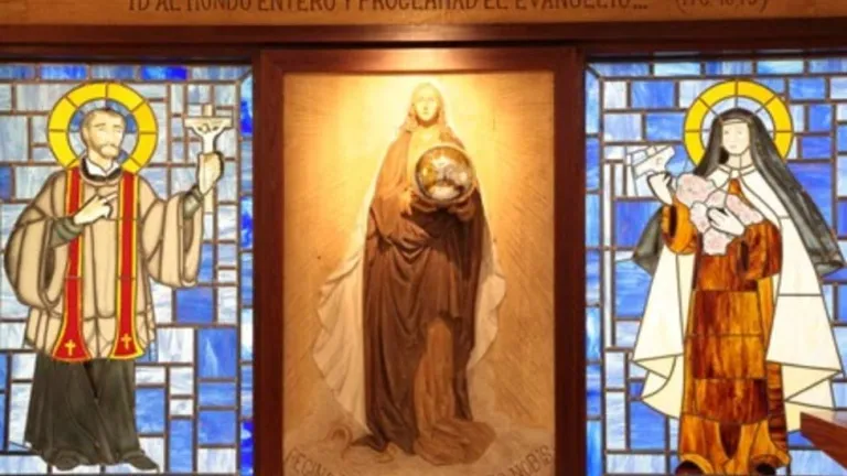 Preside la capilla un retablo centrado con una talla de la Virgen María con el título de Reina de las Misiones, cuya imagen sostiene y ofrece el sagrario con forma ovalada, símbolo del mundo. La imagen mariana está flanqueada por sendas vidrieras con las recreaciones en vidrio de San Francisco Javier y Santa Teresita de Lisieux, patrones universales de las misiones.