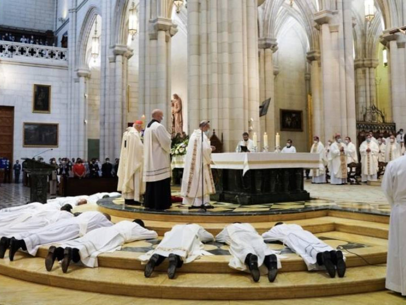 "Sabeos elegidos por el Señor. No lo habéis elegido, os elige Él para que deis el fruto que Él quiere confiaros en vuestra vida". Así se ha dirigido el arzobispo de Madrid, cardenal Carlos Osoro, a los doce diáconos que ha ordenado sacerdotes en la tarde de este sábado 8 de mayo en la catedral de La Almudena de Madrid. La ceremonia ha sido concelebrada por los cuatro obispos auxiliares de la archidiócesis ?José Cobo, Juan Antonio Martínez Camino SJ, Santos Montoya y Jesús Vidal?, los rectores del Seminario Conciliar y Redemptoris Mater, vicarios y numerosos sacerdotes. Entre los fieles, respetando el aforo y las medidas sanitarias dictadas por las autoridades a causa de la pandemia, familiares y amigos de los ordenandos.