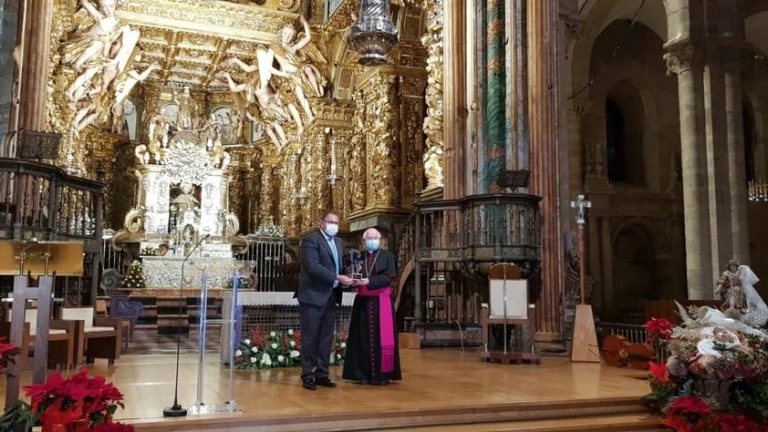 En la tarde de ayer, la Catedral de Santiago acogió el acto de entrega del “Premio Patrimonio”, que concede el Grupo Ciudades Patrimonio de España, a la Fundación Catedral de Santiago, por el reciente proceso de restauración del conjunto catedralicio. Antonio Rodríguez Osuna, presidente del Grupo Ciudades Patrimonio de la Humanidad de España y alcalde de Mérida, hizo entrega del galardón a monseñor Julián Barrio, arzobispo de Santiago y presidente de la Fundación Catedral.
