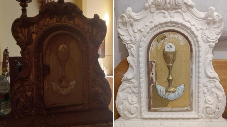 En cuanto a la fachada del Sagrario, la más dañada fue “la parte tallada en madera con formas ornamentales y vegetales con una puerta que tiene en el centro un cáliz con una Sagrada Forma”. Para enmendarlo, “estamos en proceso de estucado para aplicar el oro tal y como estaba realizado en su forma original”, ha agregado.