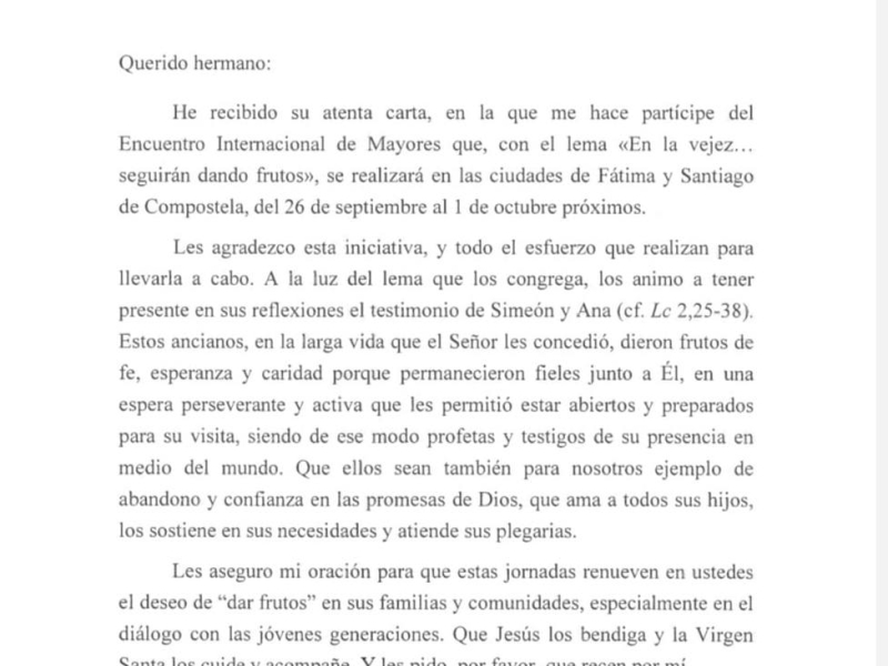 El Papa Francisco ha enviado una carta al propio presidente en la que agradece la iniciativa y el esfuerzo para llevarla acabo. “Estos ancianos, en la larga vida que el Señor les concedió, dieron frutos de fe, esperanza y caridad porque permanecieron fieles junto a Él, en una espera perseverante y activa que les permitió estar abiertos y preparados para su visita, siendo de ese modo profetas y testigos de su presencia en medio del mundo. Que ellos sean también para nosotros ejemplo de confianza en las promesas de Dios, que ama a todos sus hijos, los sostiene en sus necesidades y atiende sus plegarias”.