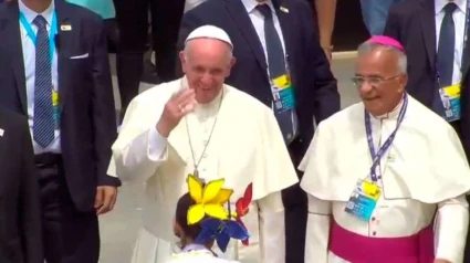 Acompañado del Arzobispo, el Pontífice saludó a diversas personas y recibió varios presentes. Un grupo de niños le obsequió un clásico sombrero "voltiao".