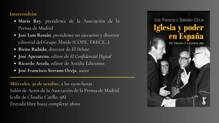 La obra "Iglesia y Poder en España" será presentada el próximo miércoles 30 en la Asociación de la Prensa de Madrid, con la participación de periodistas y expertos. Un libro que “busca ofrecer al lector un relato accesible y documentado sobre la evolución de la Iglesia española, sus conflictos internos y su impacto en la política, desvelando una historia compleja que aún tiene mucho por contar”.
