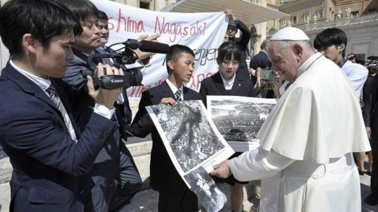 Cuando leo la historia de los mártires cristianos, cuando leo la historia de esas dos ciudades que sufrieron el ataque atómico, siento mucha admiración por vuestro pueblo. Los mártires, con esa perseverancia y esa constancia en la fe para defender lo que creían y para defender sus convicciones y su libertad cristiana. Después se podría hablar de otro martirio más humano que es el de la bomba atómica que el pueblo lo ha sufrido. Yo admiro ese pueblo cómo fue capaz de resurgir después de esa prueba infernal. Ustedes son un pueblo capaz de resurgir, que mira siempre adelante. Y una última cosa: lo que han hecho tirándoles la bomba atómica es monstruoso. Por eso quiero aquí repetir una verdad: usar la energía atómica para la guerra es inmoral.