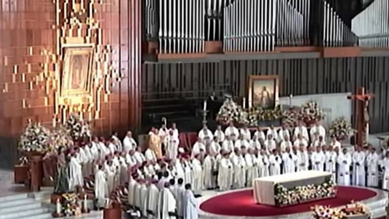 El card. Suárez Inda lee el mensaje del Papa durante la misa en la basílica de Guadalupe (Frame vide UNPF)