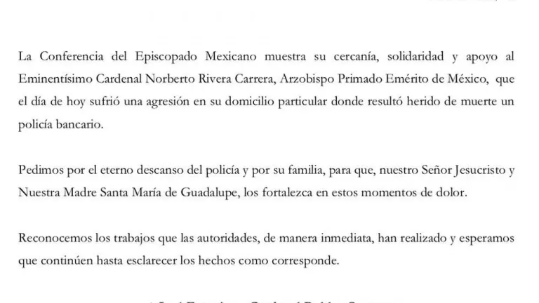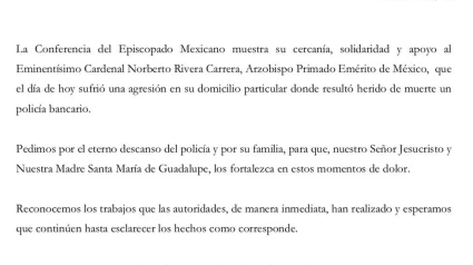 La Conferencia del Episcopado Mexicano (CEM) expresó en un comunicado (foto) "su cercanía, solidaridad y apoyo" al arzobispo primado emérito de México por el "ataque en su domicilio particular donde resultó herido de muerte un policía bancario".
