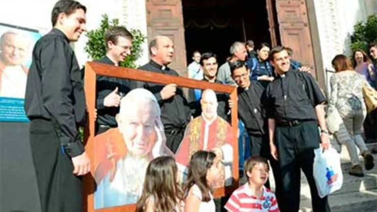 Fotografiarse con los dos nuevos santos, Juan XXIII y con Juan Pablo II, es una de las iniciativas que han emprendido estos jóvenes legionarios. Camina por los alrededores de San Pedro con un gran marco que contiene las siluetas de los dos papas, e invitan a los peregrinos a fotografiarse con ellos.