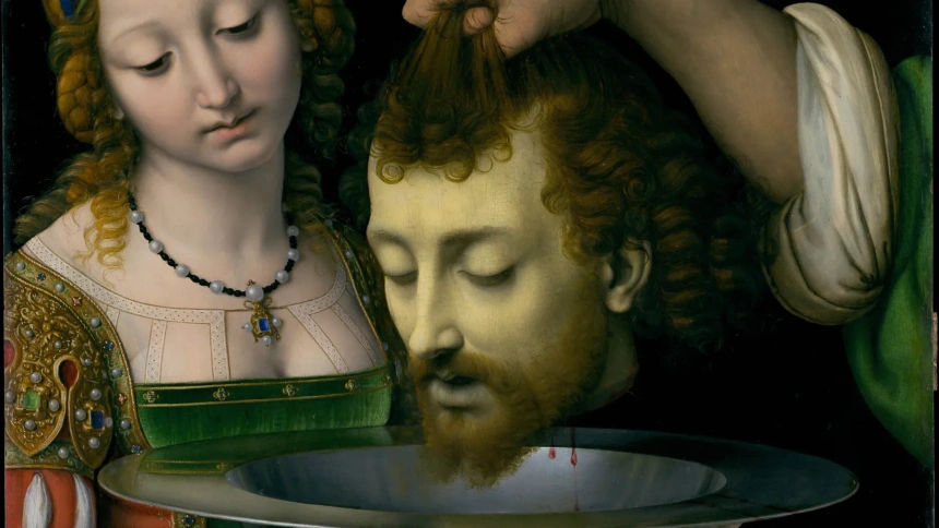 “Llegó el cumpleaños de Herodes y celebró un gran banquete, invitando a muchos personajes importantes. Y al final del banquete entró la hija de Herodías y bailó en presencia de todos, de forma que agradó mucho a los invitados y principalmente al propio Herodes. Entonces el rey juró a la muchacha: "Pídeme lo que quieras y te lo daré, aunque sea la mitad de mi reino". Ella salió fuera y preguntó a su madre: "¿Qué le pediré?" La adúltera, que vio la ocasión de conseguir al rey lo que tanto ansiaba, le contestó: "Pídele la cabeza de Juan el Bautista". La muchacha entró de nuevo y en seguida dijo al rey: "Quiero que me des ahora mismo en una bandeja la cabeza de Juan el Bautista".