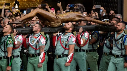 La lluvia ha obligado a acortar este jueves el tradicional acto de traslado por la Legión del Cristo de la Buena Muerte de Málaga -conocido popularmente como Cristo de Mena- hasta el trono donde, si el tiempo no lo impide, deberá realizar esta tarde su desfile procesional por las calles de la ciudad.