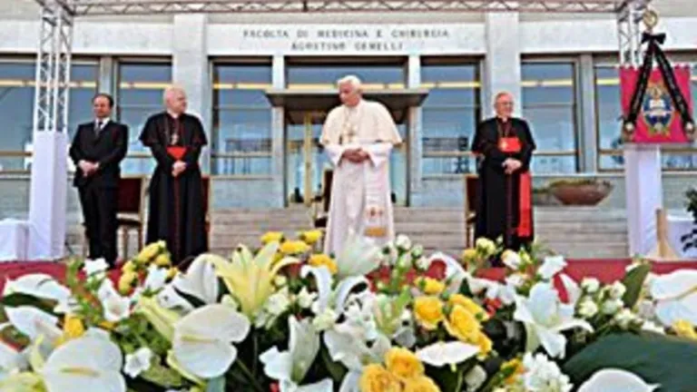 Benedicto XVI celebró ayer el 50 aniversario de la fundación de la facultad de medicina de la universidad del Sagrado Corazón y del policlínico Gemelli. Durante la visita y hablando a las autoridades políticas, civiles y religiosas, al cuerpo académico, a los representantes del personal, de los estudiantes y de los pacientes, (texto completo al final del artículo) el Papa recordó los fundamentos culturales y espirituales que sostienen la actividad de estudio y de enseñanza de la Universidad Católica y señaló que "sólo el amor garantiza la nobleza y la humanidad de la ciencia, evitando el peligro del relativismo que debilita el pensamiento y oscurece los valores éticos". Destinada a ser "lugar ?subrayó? en donde la relación educativa se pone al servicio de la persona en la construcción de una competencia científica cualificada"; lugar donde "la relación de curación no es oficio, sino misión" y donde "la caridad del buen Samaritano es la primera cátedra y el rostro del hombre sufriente el Rostro mismo de Cristo".