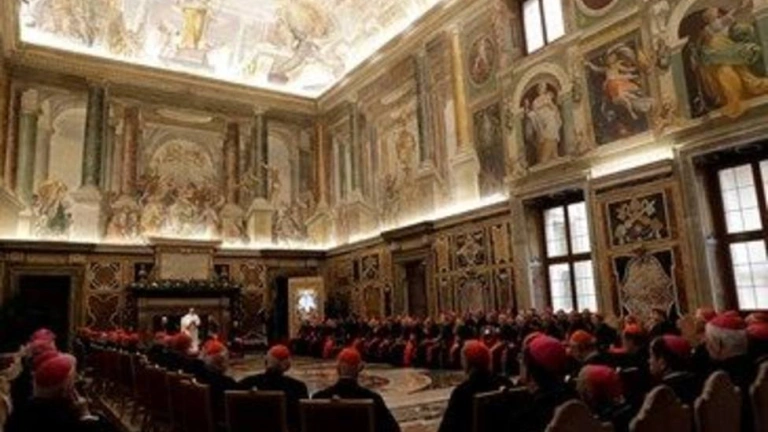La Sala Clementina del Palacio Apostólico volvió a convertirse, por cuarto año consecutivo ? el penúltimo jueves de diciembre ? en el escenario del encuentro del Santo Padre Francisco, con los miembros de la Curia Romana para el tradicional intercambio de felicitaciones ante la inminente Navidad.