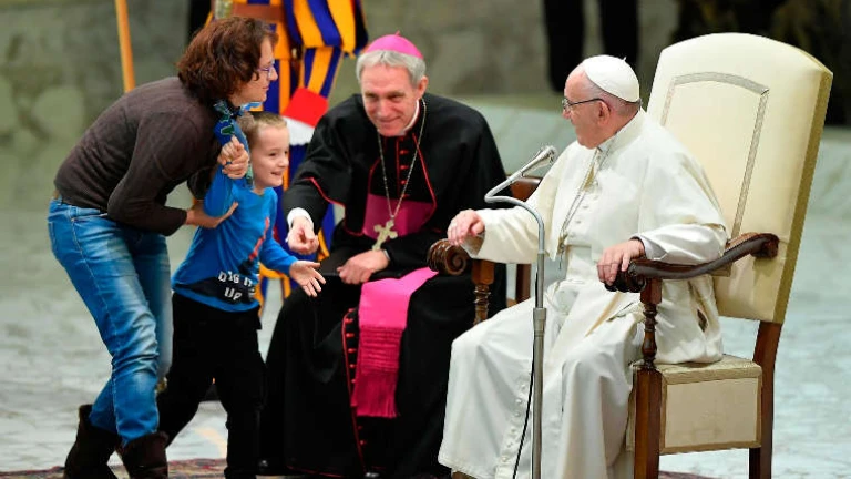 Se trata de un niño argentino de unos siete u ocho años que es autista. Estaba con su familia en las primeras filas del Aula Pablo VI, donde tenía lugar la audiencia de cada miércoles. Cuando sus padres se han querido dar cuenta de que el pequeño no estaba, este llevaba varios minutos correteando por el espacio que ocupaba Francisco. El joven ha llegado a acercarse al Papa y Francisco le ha pedido que le diese un beso.