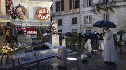 El Papa Francisco ha realizado a primera hora de esta mañana una visita al monumento a María Inmaculada situado en la Plaza de España de Roma. La Oficina de Prensa de la Santa Sede ha informado de que ha sido "un acto de veneración en forma privada" y que se ha realizado "con las primas luces del alba, bajo la lluvia". Protegido bajo un paraguas y luciendo mascarilla, el Pontífice ha permanecido en oración ante el monumento durante unos minutos.