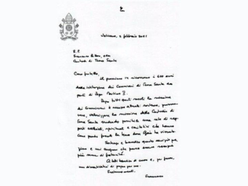 Fue un 14 de febrero de 1421 cuando se llevó a cabo la creación de los comisarios de Tierra Santa. Hoy, 600 años después, el papa Francisco escribe al Custodio de Tierra Santa, fr. Francesco Patton, para mostrarle su "apoyo" y le envía sus bendiciones por "este precioso servicio".