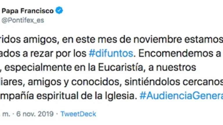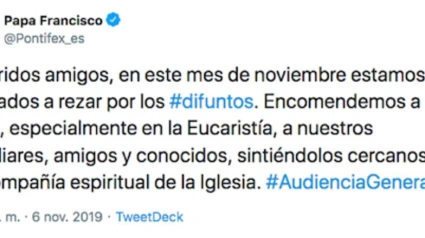 Vaticano Por los difuntos?, el Papa en TwitterPor los difuntos…, el Papa en TwitterRedacción digitalMadrid - Publicado el 06 nov 2019, 14:19 - Actualizado 14 feb 2022, 17:141 min lecturaFacebookTwitterWhatsappTelegramEnviar por emailCopiar enlace nuestros programasLa Linterna de la IglesiaCon Irene PozoViernes de 22:30h a 23:30hIglesia NoticiaCon Faustino CatalinaDomingos de 8:30h a 9:00hSanta MisaTodos los domingosDe 9:00h a 9:45hEcclesia al díaCon Raquel CaldasLunes a viernes a las 12.05hEcclesiaCon Álvaro SáezDomingos a las 13:00hMisioneros por el mundoCon Asell Sánchez-VicenteViernes a las 21:30h Lo último San Juan Pablo II 22 oct 2025, 00:00 1 min La libertad religiosa en "caída libre": Casi dos tercios de la humanidad viven en países con graves violaciones 21 oct 2025, 15:13 3 min La promesa del atleta español Paul McGrath tras su medalla mundial: “Voy a tener que entrenar un poquito" 21 oct 2025, 14:50 2 min Una vecina de Torremolinos encuentra una carpeta en la papelera y en su interior halla un documento del siglo XV de valor incalculable para Zamora 21 oct 2025, 14:47 3 min La cadena con la que estuvo atado un joven con trastorno mental durante siete años: "Tenía gusanos en el cuerpo" 21 oct 2025, 14:15 4 min “Estad como los hombres que aguardan” 21 oct 2025, 00:20 2 min Visto en ABC Qué día se cambia de hora en España, se adelanta o se atrasa el reloj y por qué