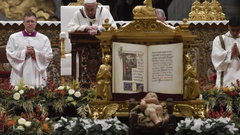 "De hecho, la "gran alegría" anunciada a los pastores esta noche es "para todo el pueblo". En aquellos pastores, que ciertamente no eran santos, también estamos nosotros, con nuestras flaquezas y debilidades".