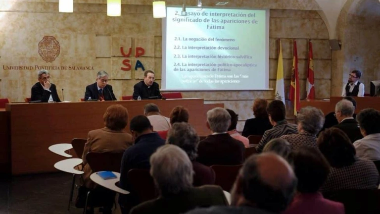 Hoy comenzará en el Aula de Grados la ponencia sobre teología de las apariciones marianas, con la conferencia ‘Nuntia siderea. La gracia de una visitación’, a cargo de Pablo Largo Domínguez, del Instituto Teológico de Vida Religiosa de Madrid. Posteriormente, se presentará la repercusión cultural, política y económica que ha tenido el hecho de Fátima en Portugal con la conferencia ‘Fátima cien años después: un cosmorama de la historia de la cultura y de la sociedad portuguesa’, por José Rui Teixeira, de la Universidad Católica Portuguesa de Porto.