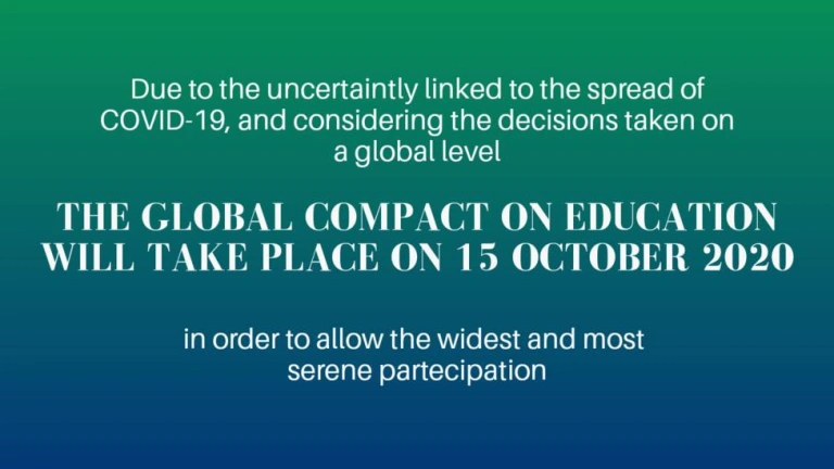 El Global Compact on Education, encuentro promovido por Papa Francisco para reanimar el compromiso para y con las jóvenes generaciones, tendrá lugar entre el 11 y el 18 de octubre del 2020. Se trata de un aplazamiento porque en principio la fecha prevista era el 14 de mayo con una serie de eventos complementarios entre el 10 y el 17 de mayo, como la "Aldea de la Educación" donde se podrán escuchar algunas de las mejores experiencias educativas internacionales explicadas directamente por jóvenes estudiantes procedentes de todos los continentes.
