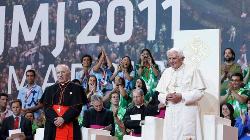 Su última visita tuvo lugar en Madrid en 2011 para presidir la Jornada Mundial de la Juventud (JMJ). Allí, en el monasterio de El Escorial, ofreció un discurso a jóvenes profesores universitarios sobre la unión de razón y fe frente al relativismo. En la homilía de Cuatro Vientos, animó a los jóvenes a "edificar sus vidas sobre Cristo" y a vivir la fe en comunión con la Iglesia.